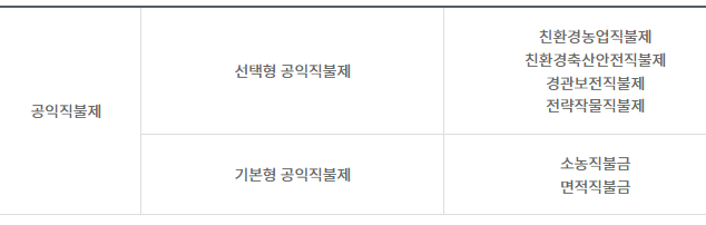공익직불제는 농림축산식품부에서 운영하고 농업활동을 통해 식품안전, 환경보전 그리고 농촌유지 등을 할 수 있도록 농업인들에게 보조금을 지원하는 제도입니다. 공익직불제는 선택형 공익직불제와 기본형 공익직불제로 구분이 됩니다. 선택형 공익직불제는 친환경농업직불제도, 친환경안전축산물직불제도, 경관보전직불제도, 전략작물직불제도로 구성이 됩니다. 또한 기본형 공익직불제는 소농직불금과 면적직불금으로 구성이 됩니다.