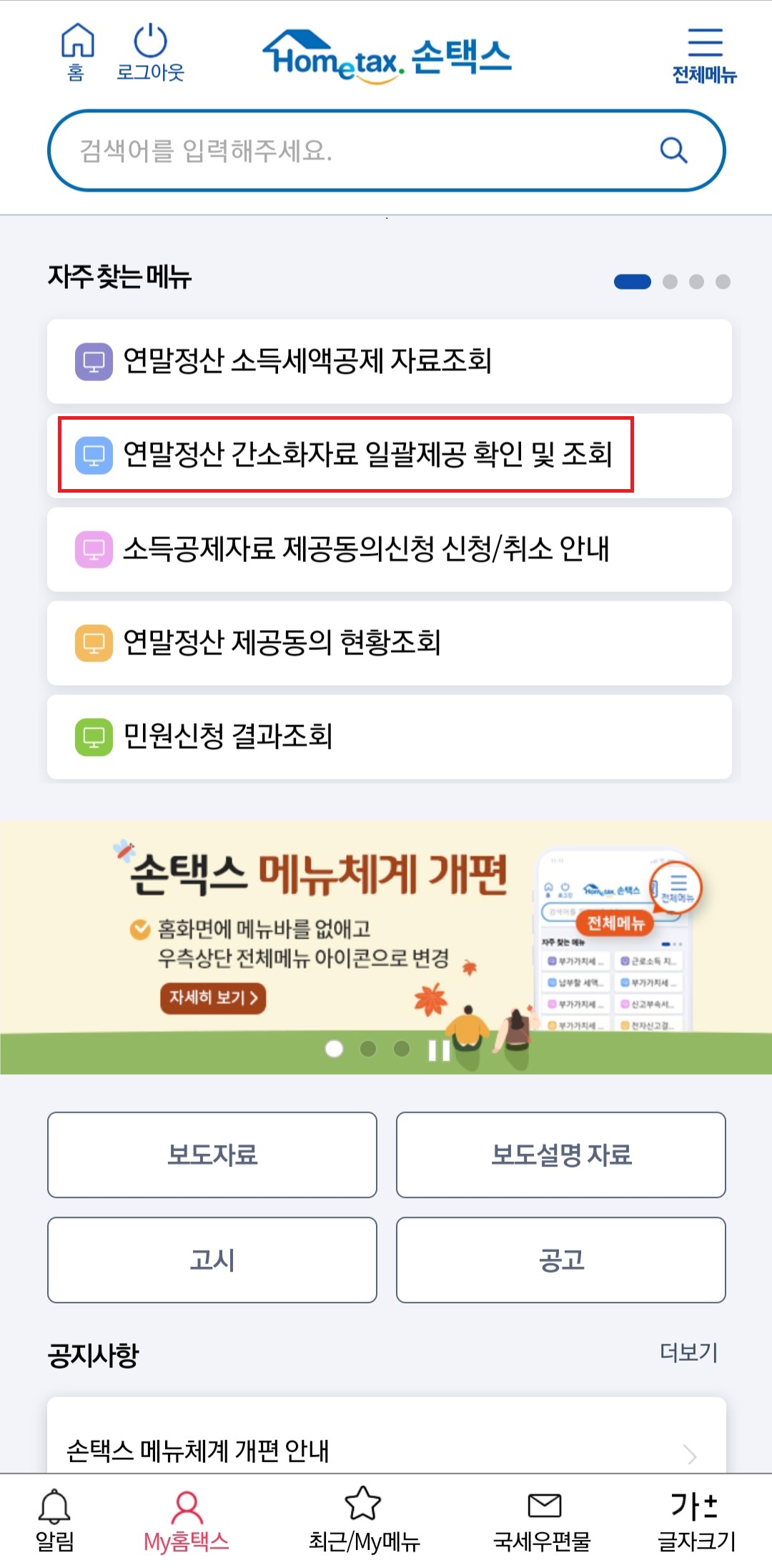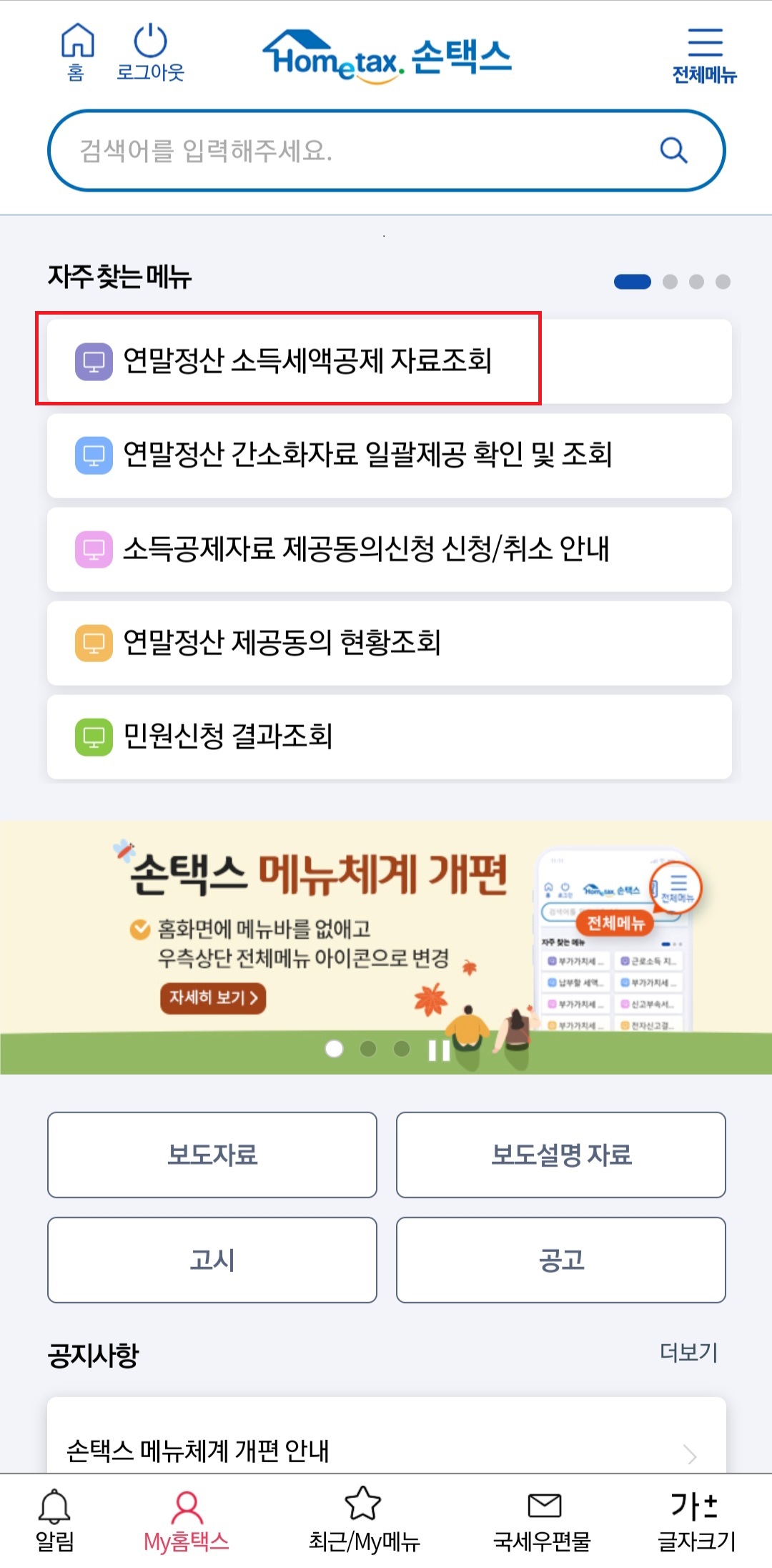 9. 다시 손택스 메인화면으로 와서 소득세액공제 자료조회를 클릭해 줍니다.