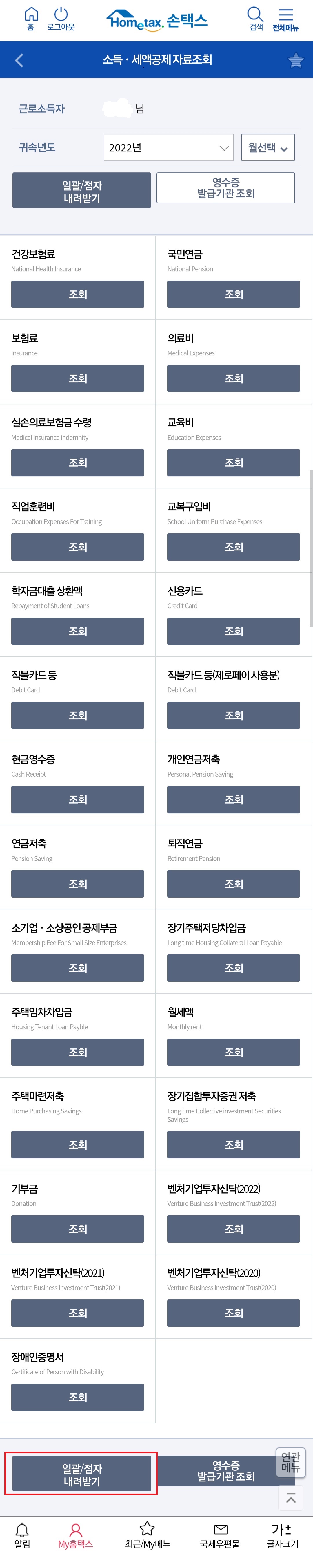 10. 건강보험료 등 '조회'를 클릭 후 '일괄/점자 내려받기'를 클릭해 줍니다.