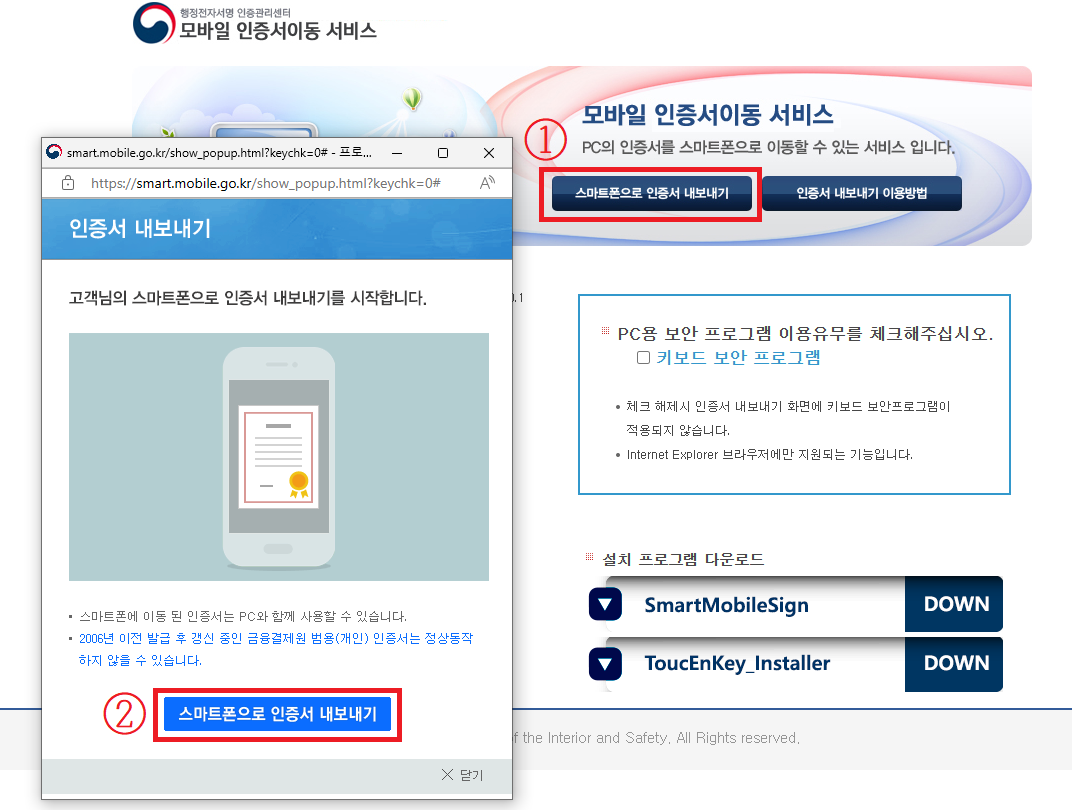 4. 모바일 인증서이동 서비스에서 스마트폰으로 인증서를 내보냅니다.