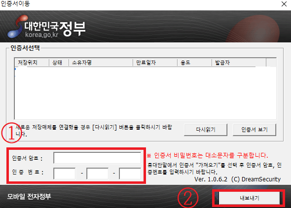 6. 인증서 선택 후 인증서 암호와 모바일에서 나온 12자리 인증번호를 입력하고 내보내기를 클릭합니다.
