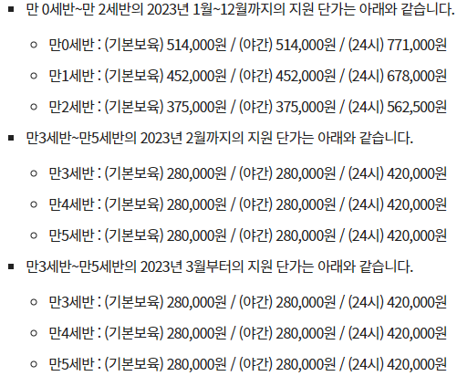 지원금은 만 0세부터 2세 반, 만 3세부터 만 5세 반으로 구분되며, 기본교육, 야간교육, 24시간 교육으로 나뉩니다. 자세한 내용은 아래 표와 같습니다.