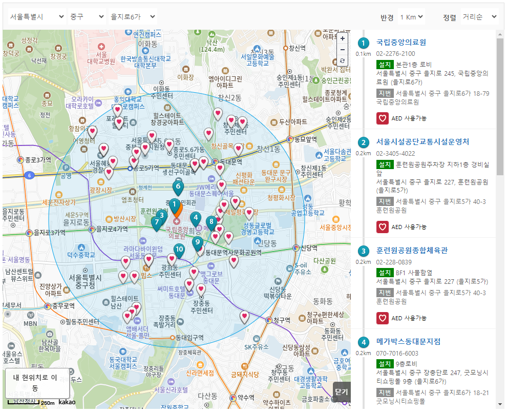 응급실 찾기 메인 화면과 유사하게 반경을 설정하면 본인의 위치에서 가까운 순으로 자동심장충격기의 위치를 확인하실 수 있습니다.