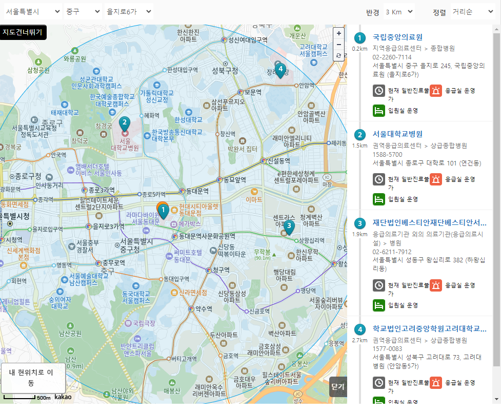 아래와 같이 본인의 위치를 지정하면 반경을 설정하여 근처에 가장 가까운 응급실의 위치를 찾을 수 있습니다.