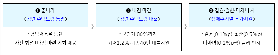 청약 통장을 신설하면 역대 최초로 청약통장과 대출은 연계하여 장기 및 저리 대출을 지원하고 결혼·출산·다자녀 등 생애주기에 걸쳐 추가 혜택을 부여하고 있습니다.