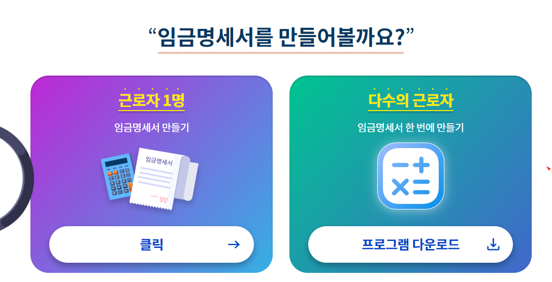임금명세서는 고용노동부에서 무료 프로그램을 통하여 계산할 수 있습니다. 계산방법은 '근로자 1명'과 '다수의 근로자'로 작성할 수 있습니다. 아래는 임금명세서 홈페이지 모습입니다.