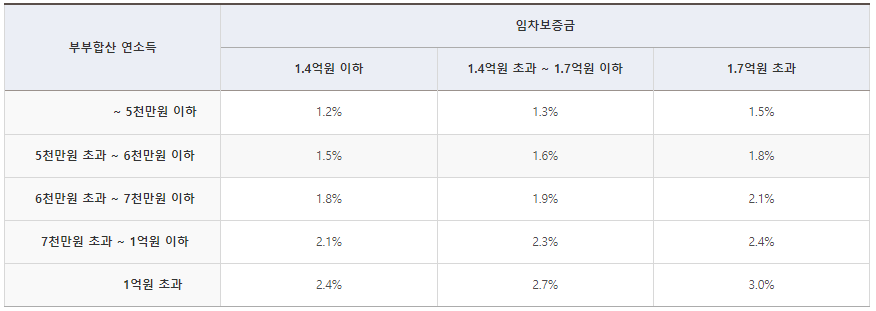 3-4. 대출한도: 2.4억 원 이내(최우선변제금 대출 포함한 금액)이며, 최우선변제금 대출한도는 아래 표와 같습니다. 예를 들어 서울특별시에 임대차계약이 되어 있는 사람이 최우선변제금을 포함하여 2억 원을 대출받으려면 최우선 변제금 5,500만 원은 무이자로 대출가능하고 나머지 1억 4,500만 원은 부부합산 연소득에 따라 이자는 1.3%에서 2.7%로 대출이 가능합니다.
