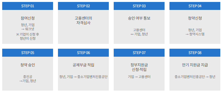 2-1. 지원대상은 구직자인 청년과 사업자인 기업으로 나누게 됩니다. 청년부터 알아보자면 연령은 만 15세 이상 34세 이하이며 군 경력자는 복무기간에 비례하여 최고 만 39세로 한정하여 적용 가능합니다. 고용보험 이력은 정규직 취업일 현재 고용보험 이력이 없거나 최종학교 졸업 후 고용보험 총 가입기간이 1년 이하인 자입니다. 학력은 제한이 없으나, 정규직 취업일 현재 고등학교 또는 대학 재학과 휴학 중인 자는 제외이며 졸업예정자는 가능합니다. 참고로 중소기업진흥공단의 '내일채움공제'에서 파생된 제도이며 기존의 내일채움공제와 다른 점은 정부가 보조금 방식으로 중소기업의 몫까지 납입한다는 차이점이 있습니다.
