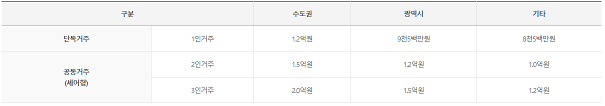 아래의 표는 전세금 지원 한도액입니다. 수도권과 광역시 그리고 기타로 구분이 되어 있으며 단독거주 또는 공동거주에 따라 한도액은 차이가 있습니다. 참고로 지원 한도액을 초과하는 주택의 경우 전세금액을 청년 입주자가 부담할 경우 지원이 가능합니다.