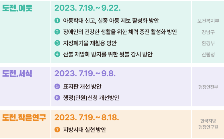 대국민 아이디어 공모전은 행정안전부에서 주관하고 더 나은 사회를 위한 국민 참여 프로젝트로써 생활 속 크고 작은 사회문제를 직접 해결할 수 있는 아이디어 공모를 통해 해결하고자 하는 제도입니다. 공모기간은 2023년 7월 19일부터 9월 22일까지입니다. 공모분야는 이웃, 서식, 작은 연구로 3 분야입니다.