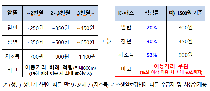 - K패스 회원 전환 절차를 받으면 별도의 카드 재발급 없이 그대로 사용 가능(K패스 혜택 동일)